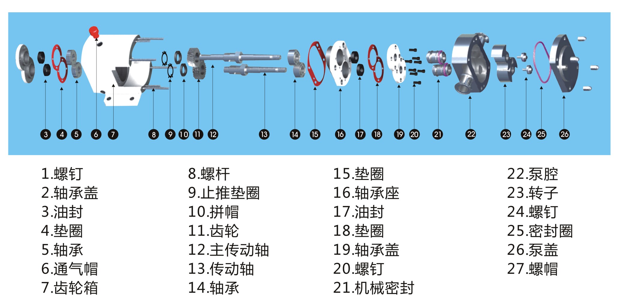 7.泵的葉輪與傳動齒輪分開,且在泵腔內各零配件之間保證一定的間隙,相互不接觸,伍磨損,低噪